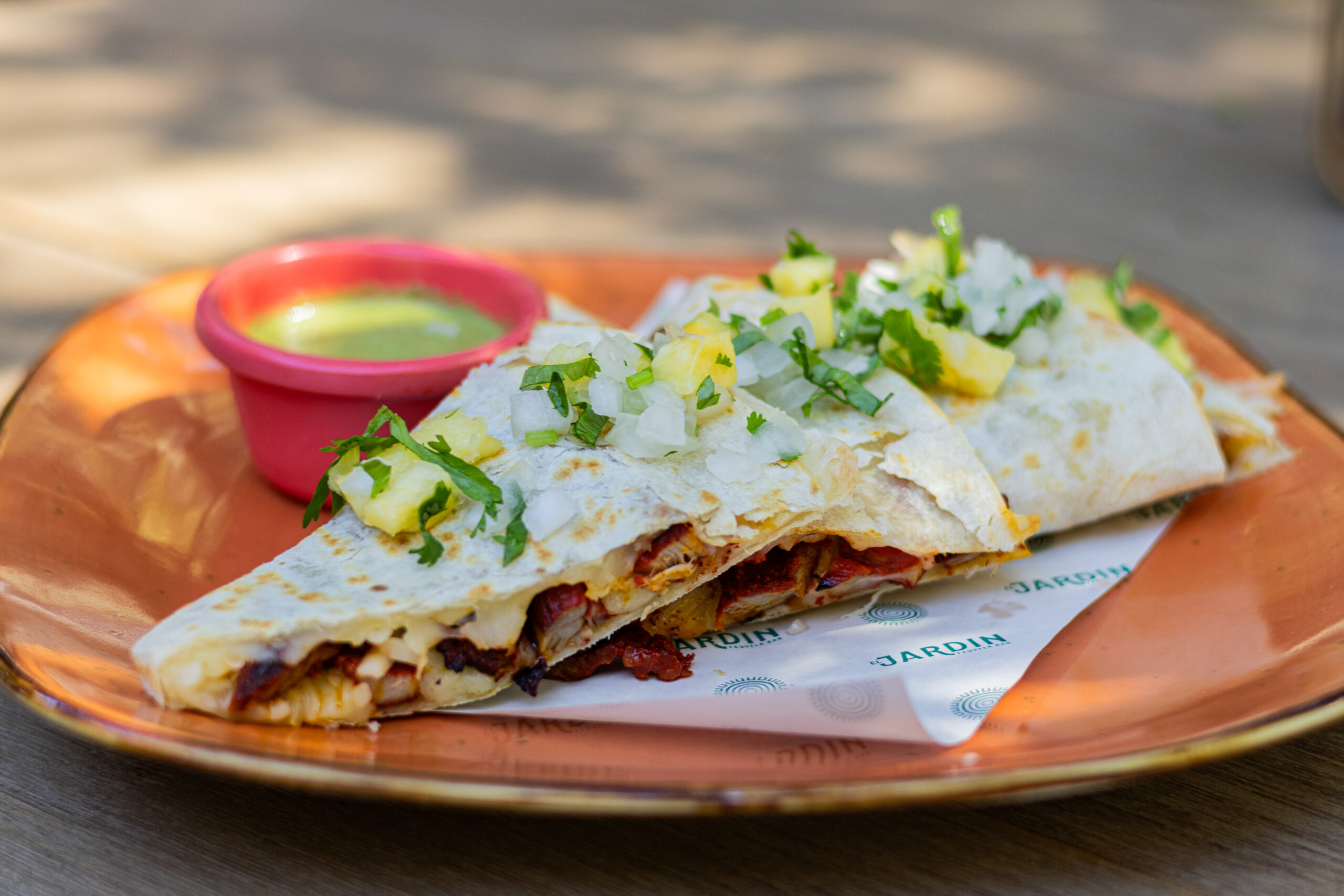 A Mexico City favorite — flour tortilla quesadilla filled with juicy al pastor meat and melted cheese, grilled to perfection.